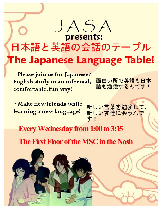 The Japanese English Language Table meets every Wednesday from1:00 to 3:15 pm on the first floor on the MSC.