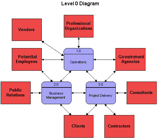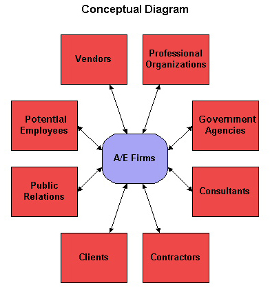 To really understand how Information Systems can have a positive effect, we need to look at the value of all the processes used in A/E firms. As with many types of organizations, there is a need to break down processes so they can be assigned to different groups. In the A/E industry these groups would be something like this: Architects, Engineers (Mechanical, Electrical, Plumbing - MEP), Marketing, Accounting, Planners, Project Managers, and Administrators. These groups are getting divergent data in different formats from many external groups, which can be seen in the Conceptual Data Flow Diagram (DFD) below.