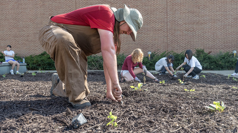 In addition to our community garden, UMSL Sustainability works with Facilities Management, EAO, UMSL Biology, and GreenTeam volunteers, to provide beautiful Native Landscapes on campus. The Native Garden spaces are located at the UMSL Recreation and Wellness Center near the bike racks, which are available to work in during the hours posted on TritonConnect. The community garden is surrounded by a native prairie managed by Facilities and the GreenTeam.