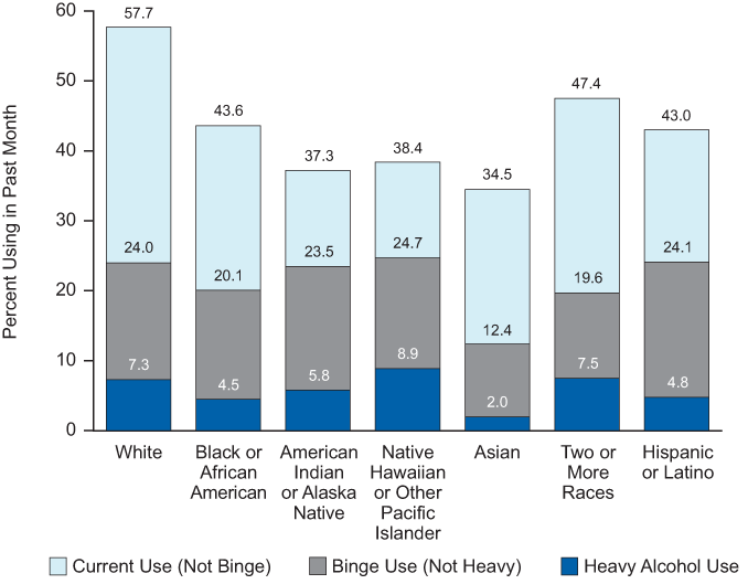 - Among persons aged 12 or older, whites in 2013 were more likely than other racial/ethnic groups to report current use of alcohol (57.7 percent). The rates were 47.4 percent for persons reporting two or more races, 43.6 percent for blacks, 43.0 percent for Hispanics, 38.4 percent for Native Hawaiians or Other Pacific Islanders, 37.3 percent for American Indians or Alaska Natives, and 34.5 percent for Asians.