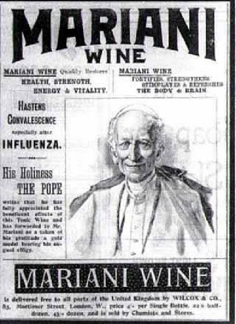 Mariani wine (1875) was the most famous Coca wine of it's time. Pope Leo XIII used to carry one bottle with him all the time. He awarded Angelo Mariani (the producer) with a Vatican gold medal.