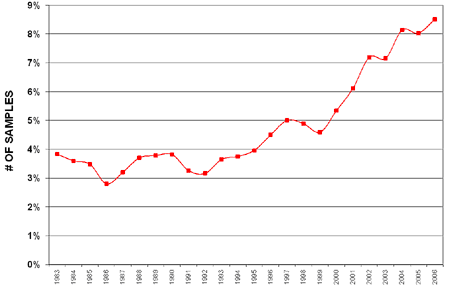 just under 4 percent reported in 1983 and represents more than a doubling in