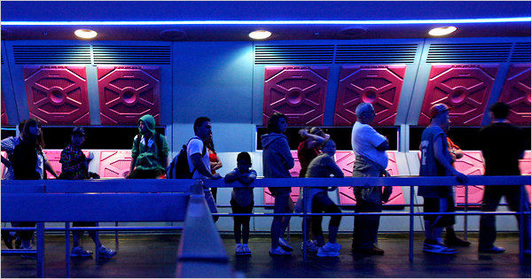 Visitors wait in line at the Space Mountain attraction at Walt Disney World in Orlando, Fla. Disney has installed game stations along the way to entertain visitors while they wait.