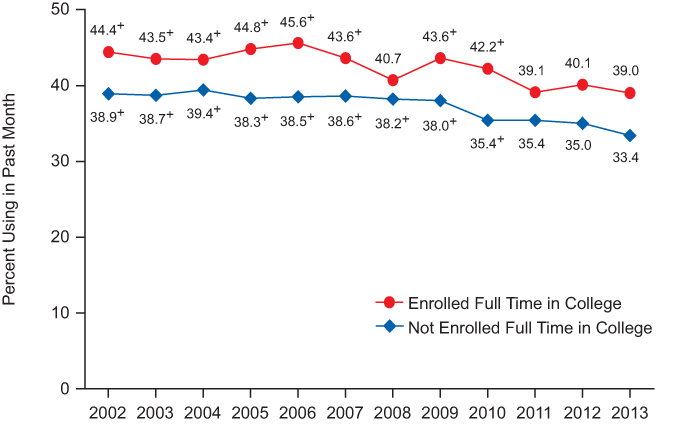 - The pattern of higher rates of current alcohol use, binge alcohol use, and heavy alcohol use among full-time college students than the rates for others aged 18 to 22 has remained consistent since 2002.