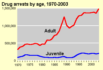 - War on Drugs Shifts to War on Marijuana ("A study of FBI arrest and conviction data by a Washington think-tank has underscored a dramatic shift in US drug policy in the decade of the 1990s. "The War on Marijuana: The Transformation of the War on Drugs,", released Tuesday by the Sentencing Project, reports that from 1992 to 2002, the proportion of drug arrests involving marijuana increased from 28% to 45% of all drug arrests, while arrests for the much more dangerous cocaine and heroin decreased from more than half of all drug arrests to less than 30%. " http://stopthedrugwar.org/chronicle/385/shifted.shtml 5/6/05)
