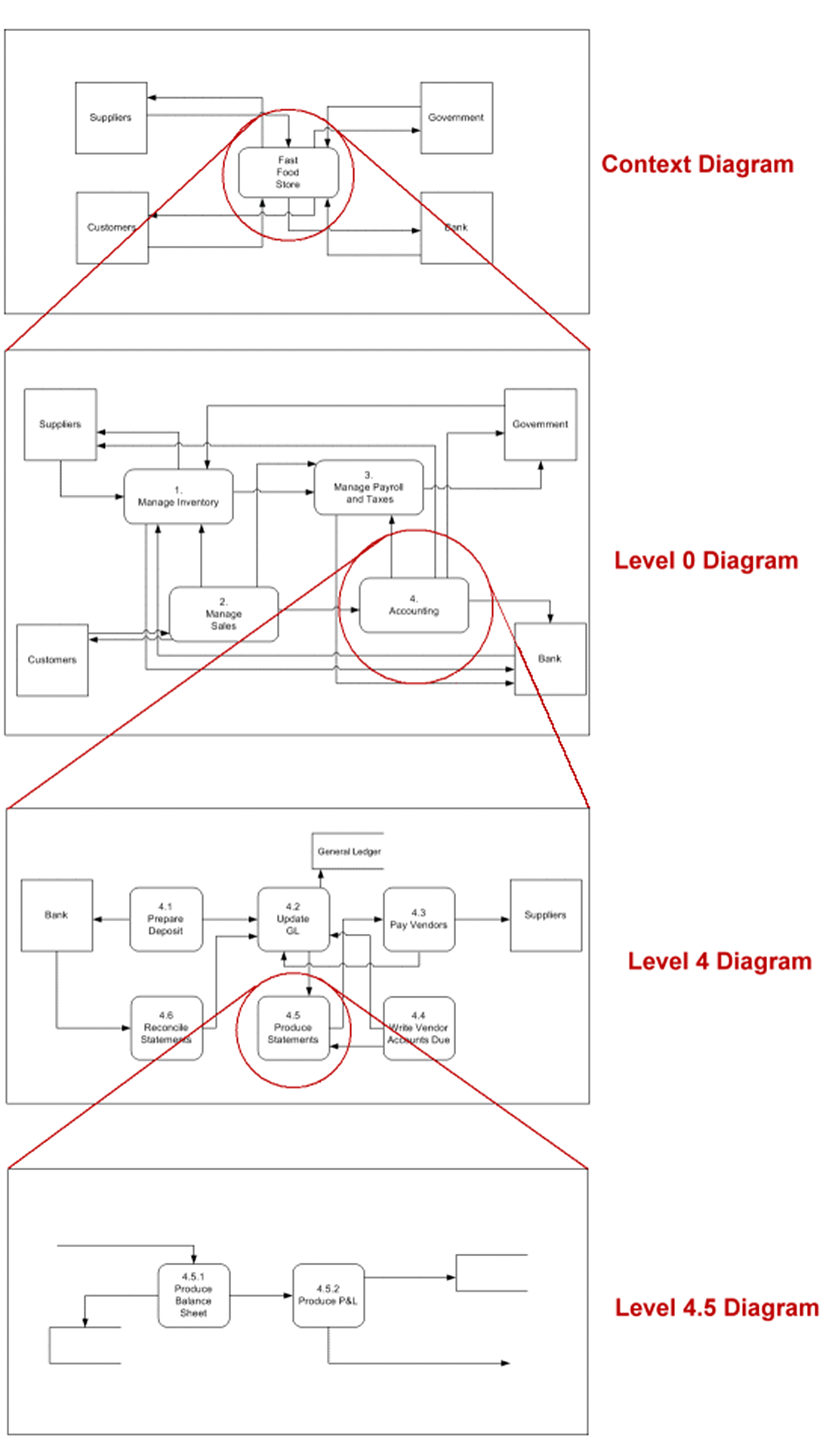 - Level x Diagram: Shows the processes that make up each of the major subsystems