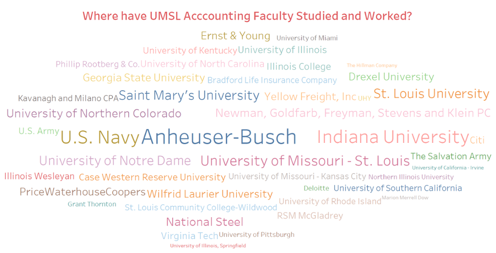 We are proud of our world-class faculty. UMSL Accounting faculty members hold Ph.D's from top doctoral programs in Accounting, have published in premier academic journals, and have won numerous prestigious teaching awards. Before entering academe, each gained extensive professional experience at organizations including the "Big Four" CPA firms, local CPA firms, and prominent corporations.