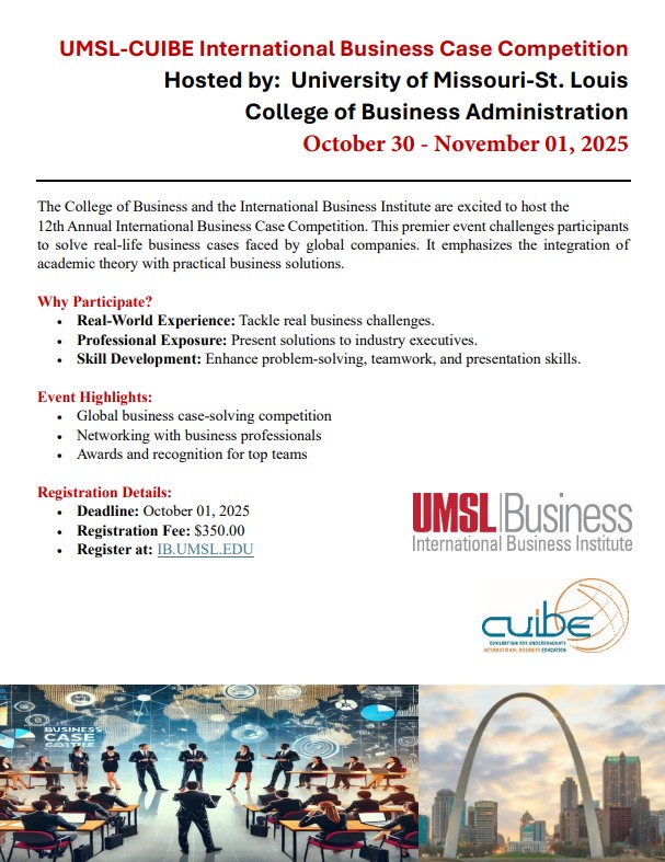 The next IB Case Competition will be hosted by the University of Missouri - St. Louis from October 30th-November 1st, 2025 . The registration fee is $350, and only eleven spots remain, available on a first-come, first-serve basis. For registration details, please contact Renita Miller ( millerrs@umsl.edu / 314-516-7226).