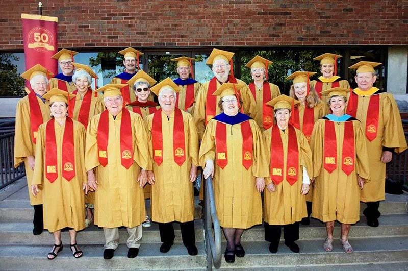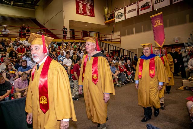 The Alumni Reception - In May 2018 was the 50 th anniversary of the second graduating class in 1968, held in the Solarium of the Science Learning Center. Four of our 1968 graduates attended along with about 15 others and 30 or so faculty, students and family members. Here are some pictures including the four '68 graduates, left to right Mike Hasser, Ray Novak, Wiley Moore and Harland Kalman, a commencement procession, the whole group of '68 graduates, the chemistry gathering, Wiley Moore addressing the latter, Professor Dupureur welcoming the chemists, Mike Hasser with students and faculty, Harland Kalman receiving his pin from Chancellor George and Ray Novak with Chancellor George.