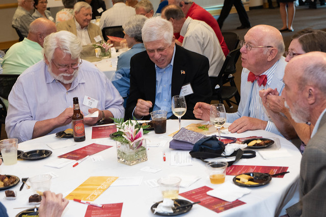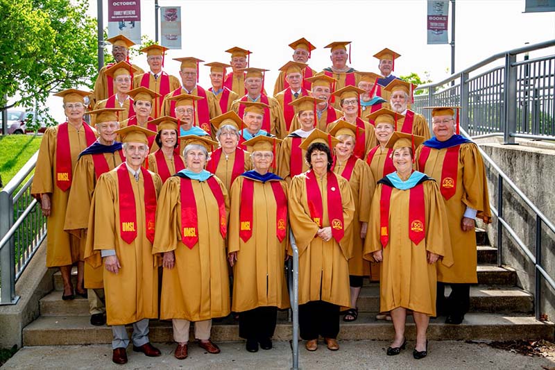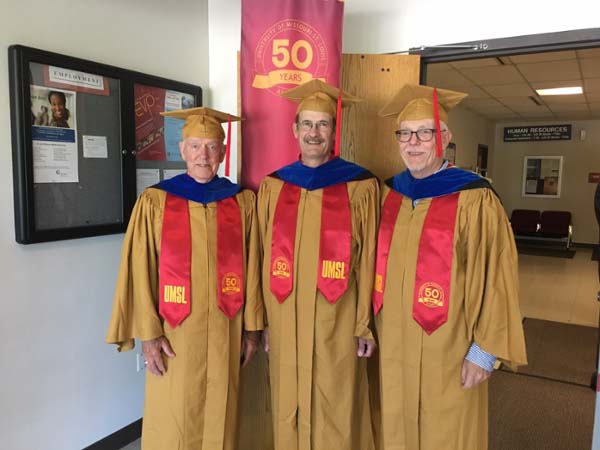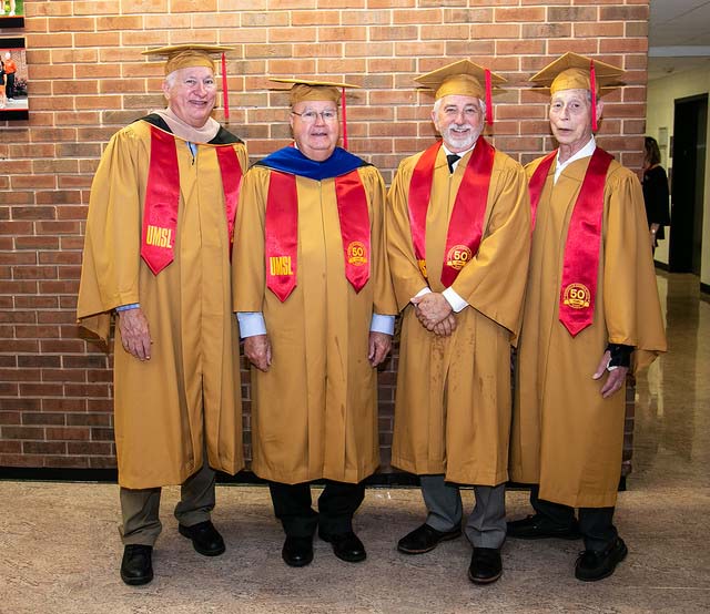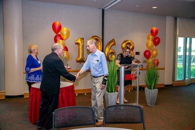 The Alumni Reception - On May 19, 2019 was the 50th anniversary of the third graduating class in 1969, and also the 2019 graduates was a great success. The 2019 graduates and their families and friends attended a luncheon in the Whittaker Room in the Touhill Performing Arts Center, following the Commencement exercises. The actual reception was held a little later in the Solarium of the Science Learning Center. Here is a picture of some of the students and faculty at the luncheon, also one of Dr. Dupureur welcoming those present.