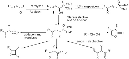 The last decade has seen a rapid expansion in the interest in the asymmetric synthesis of 1-substituted phosphonates. The unique properties of phosphorus provide a fascinating and challenging approach to stereoselective reactions. Our goal is to examine the use of chiral phosphonamides and phosphonates in stereoselective reactions. We reported the first example of a lathanide chiral catalyst in the addition of simple phosphites to achiral aldehydes. More recently, we discovered some promising titanium alkoxide systems. We are attempting to expand the chemistry of allylic hydroxy phosphonamides and phosphonates formed in the chemistry discussed above. Allylic hydroxy phosphonates are similar to regular allylic alcohols and should undergo similar chemistry. However, the presence of the phosphonate significantly alters the electronics of the system, and enables control of both regiochemistry and stereochemistry. Our initial work focused on the palladium catalyzed addition of amines to the carbonate derivatives of allylic hydroxy phosphonates, and several examples of this reaction have been performed. The rearrangement proceeds with complete retention of chirality. A number of 3,3 sigmatropic rearrangements and alkene addition reactions have been studied. The newly developed chemistry of the hydroxy phosphonates is being applied toward the synthesis of the cathepsin B, cruzain, and renin inhibitors, lactones and lactams.