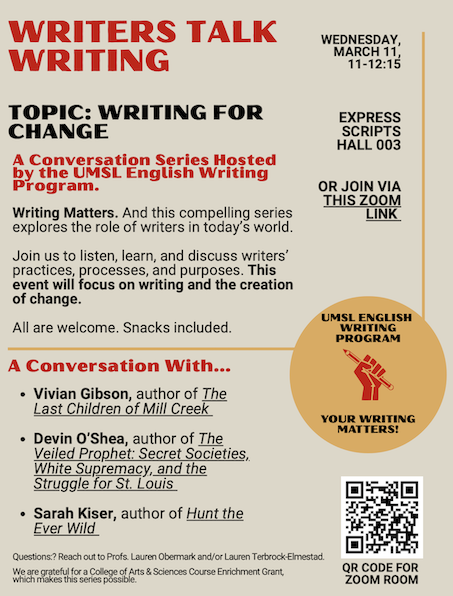 Writers Talk Writing is a conversation series hosted by the UMSL English Writing Program as a space to listen and discuss writing practices and processes with UMSL writers. We are all writers! Professors, students, and staff members in the UMSL community are writing all of the time. In these conversations, we show (and celebrate) the practices and processes of UMSL writers in today’s world.
