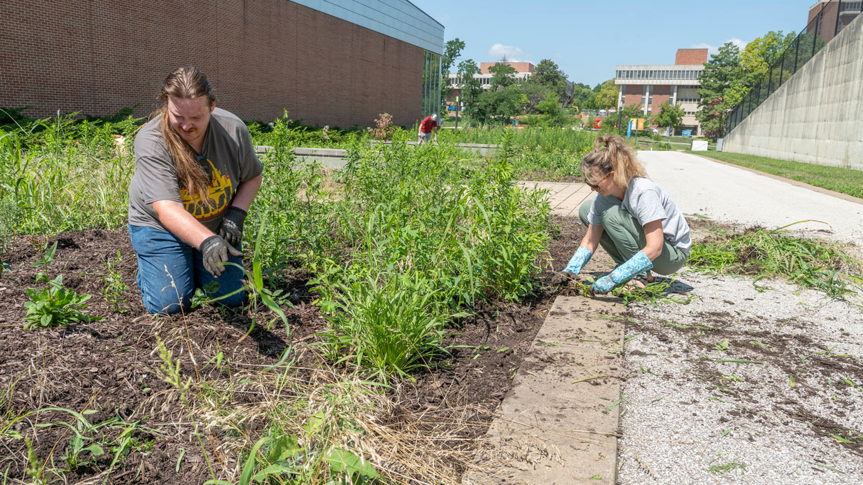 In addition to our community garden, UMSL Sustainability works with Facilities Management, EAO, UMSL Biology, and GreenTeam volunteers, to provide beautiful Native Landscapes on campus. The Native Garden spaces are located at the UMSL Recreation and Wellness Center near the bike racks, which are available to work in during the hours posted on TritonConnect. The community garden is surrounded by a native prairie managed by Facilities and the GreenTeam.