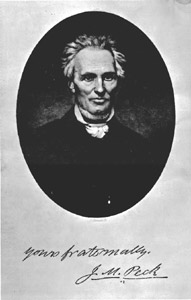 | Peck, J. M. The Principles and Tendencies of Democracy; An Address Made in Belleville, St. Clair County, Illinois, July Fourth, 1839. Belleville, Ill.: Cannon, 1839. Catalog No. JG/P33. (Possibly a copy owned by Peck.) |