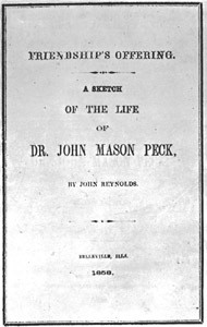 | Reynolds, John. Friendship's Offering. A Sketch of the Life of Dr. John Mason Peck. Belleville, Ill.: Advocate, 1858. (Uncatalogued.) |