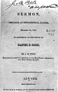 | Peck, J. M. A Sermon, Preached at Edwardsville, Illinois, December 25, 1827, in Reference to the Death of Daniel P. Cook. Edwardsville, Ill.: R. K. Fleming, at the Office of the Illinois Corrector, 1828. Catalog No. EC769/P33. (With Peck Ownership Inscription, J. M. Peck, to be Preserved. |