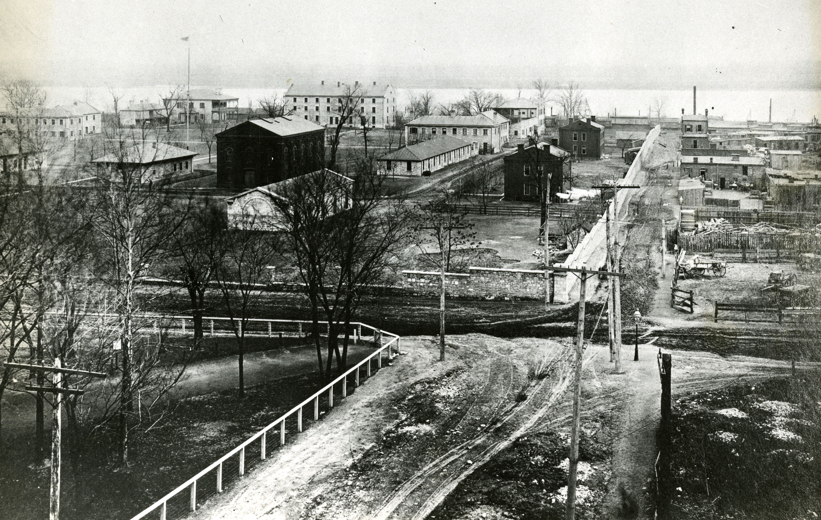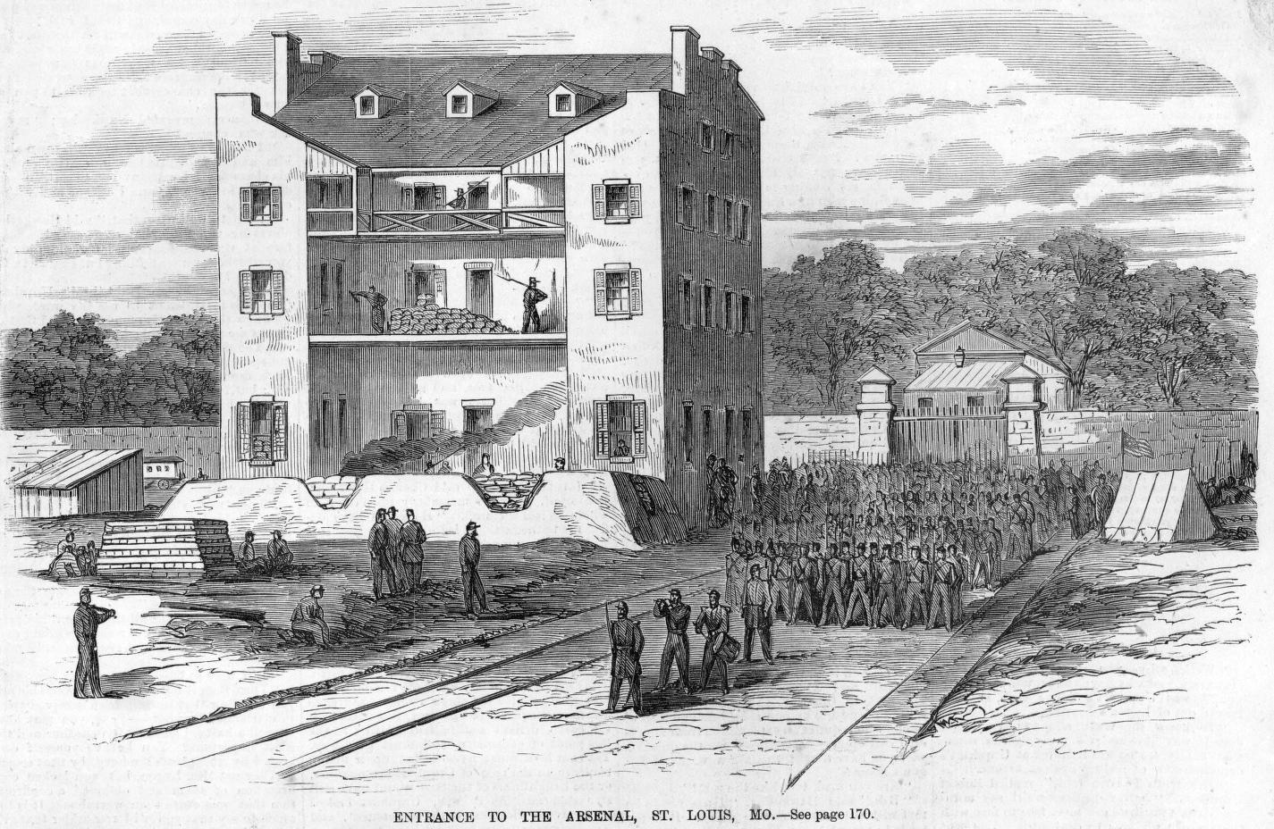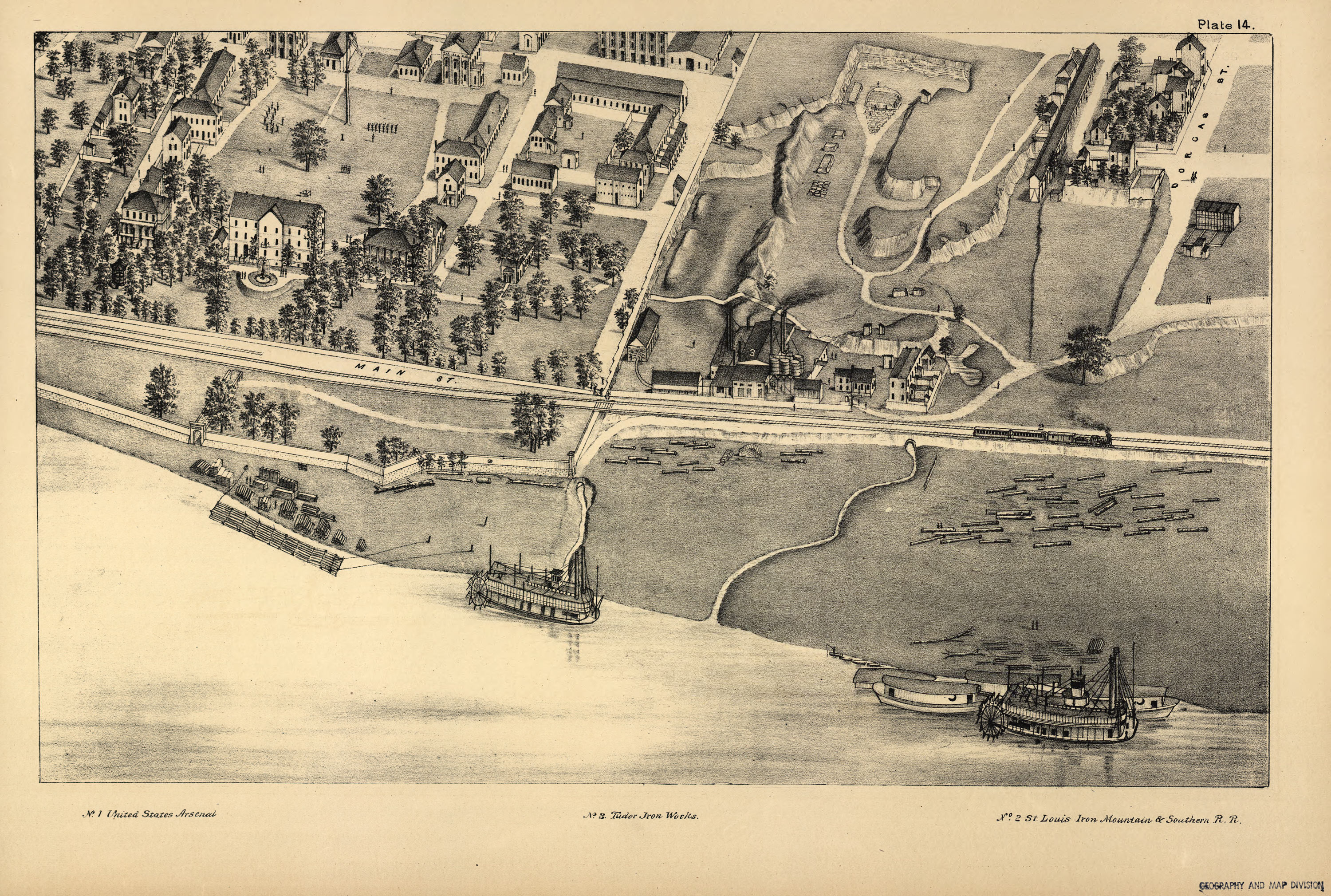 An object of interest is the UNITED STATES ARSENAL. It is located on the river front, immediately opposite Arsenal island, between Arsenal and Utah streets. During the Civil War this was a very important and busy point on the map in the West. It was the depot for the Army and Navy gunboat service munitions, was crowded with soldiers, both cavalry and infantry. Thousands of cannons of all sizes for fortress, for gunboat, for artillery, lay in great rows, miles in length, and huge mortar and cannon balls were arranged in huge pyramids, and to be seen at every turn. Besides the several fine residences used, as officers' headquarters, are a number of massive stone buildings, which were used for the storage of small arms, ammunition, and different army accoutrements. Other of the buildings were used for manufacturing ammunition for the different branches of the service, and others for the mounting of cannons on carriages; and the preparing of outfits for regiments for active work on the war front. Ten miles from the city by the Iron Mountain road is located the Jefferson barracks, the cavalry headquarters, and depot for the West, where several regiments are always stationed.