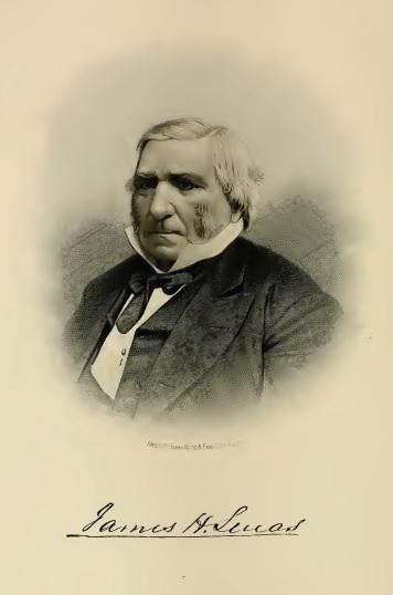 JAMES H. LUCAS was born at Pittsburg, Pennsylvania, November 12, 1800, and was consequently aged seventy-three at his decease. His father, John B. C. Lucas, was a native of Normandy, received a liberal education at the University of Caen, and visiting Paris after the close of the American revolution, adopted the recommendation of Dr. Franklin, and with other chivalric, ambitious young Frenchmen, emigrated to America. James le Ray du Chaumont, at whose father's house, near Passy, Franklin and Adams were domiciled, also came to the United States about the same time, and bought immense tracts of land in Otsego and Jefferson counties, New York. Mr. Lucas went to Pennsylvania, and settled in Pittsburg, where he subsequently was appointed judge of the District Court, was efficient in enforcing the law during the whiskey rebellion, and represented the State in the National Congress. Before the year 1800, he was sent on a special mission, by Mr. Jefferson, to the then Territory of Louisiana, to sound the people in regard to the acquisition of the country by the United States, and thereby give unobstructed navigation to the mouth of the Mississippi for our commerce. On this mission he became impressed with the site of the "future great city," but Ste. Genevieve being then the most important point, he went there, and had a conference with Francis Valle, the Spanish commandant. The object of his diplomatic visit was concealed, and it is said that he went under the assumed name of Du Panthro. After the acquisition of Louisiana, he was appointed by President Jefferson one of the judges of the Territory, and, in conjunction with Governor Wilkinson and Return Jonathan Meigs, commissioner to adjust land titles. He removed to St. Louis with his family in 1805, the tedious journey being made on keel-boats down the Ohio and up the Mississippi.
