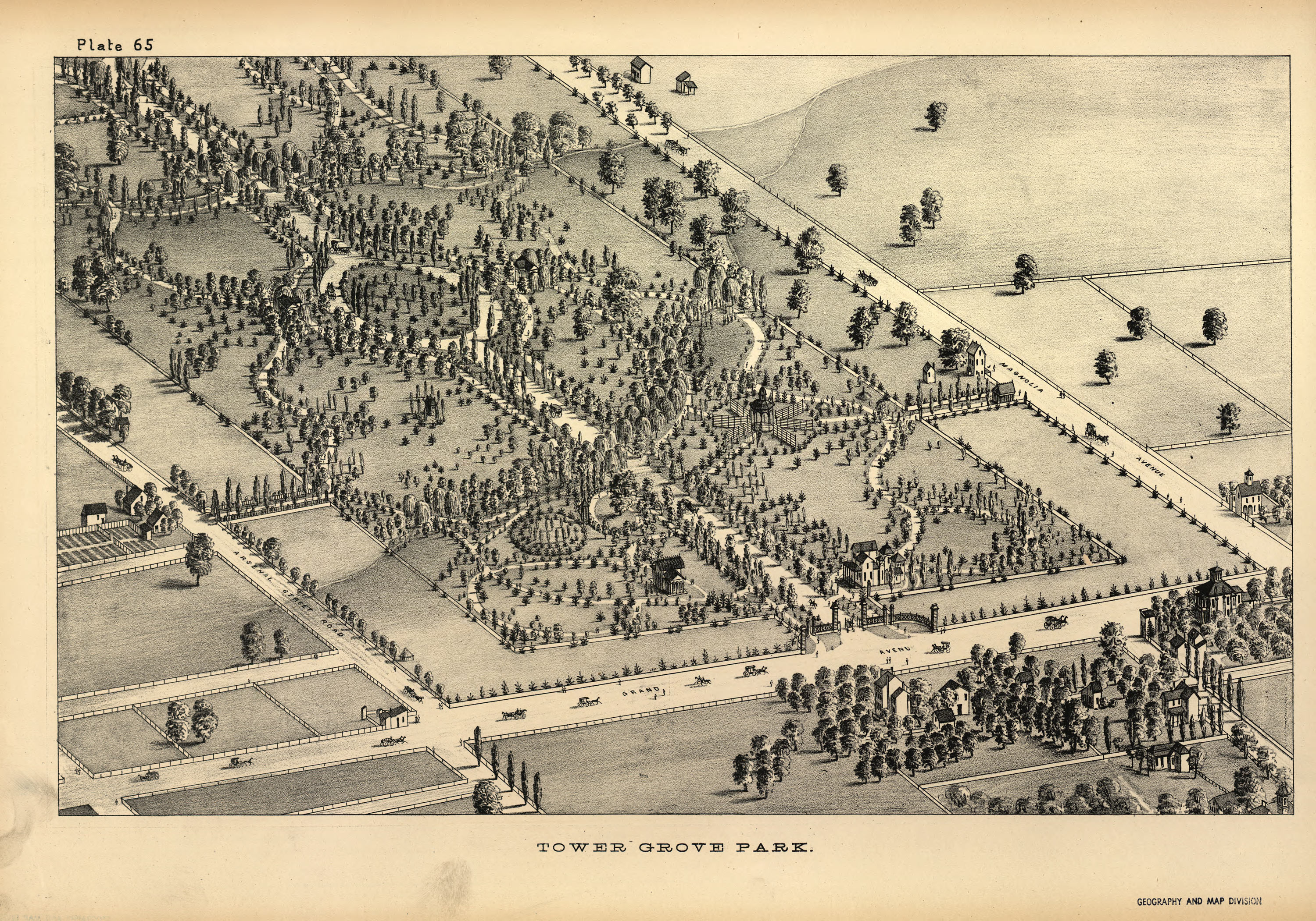 Tower Grove Park in the southwestern part of the city, occupying almost the whole of plates 65 and 94, was acquired in October, 1868. The land was a donation from Henry Shaw, Esq., and comprises altogether about 350 acres. The original tract, as given by Mr. Shaw to the city, contained 276 acres, a strip of two hundred feet on the north and south sides having been reserved for his own use. Mr. Shaw has since signified his intention of giving this strip also to the city, and it may therefore be considered a part of the park.