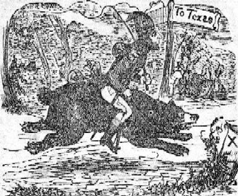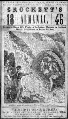 In the 1840s the printing was taken over by Turner & Fisher, and although this may be the most widely circulated edition, a significant change in tone occurs in the entertaining reading. The humor becomes more aggressive, with more overtly racial references and frequent use of scatological humor. Crockett himself is portrayed as the buffoonish object of the harshly humorous stories. In spite of the negative turn to the stories transplanted into the Almanacks by the current publisher, the humorous exaggerations included in the stories are generally recognized as building on the frontier tradition of spinning tall tales. These same stories participate in the creation of the myth of frontier life as experienced second-hand by citizens of Eastern cities. The stories told of Crockett’s life and adventures digressed so completely from any reference to the historical figure that John Seelye has characterized the mythical Davy as “a hokey hero sprung from the printer’s font.” Typical stories from the 1840s include “Colonel Crockett’s Trip to Texas and Fight with the Mexicans” in which he rides his pet bear who runs so fast “his eternal speed had scalded all the hair from his back” (1845) and the tale of “Crockett Killing Rattle-Snakes in which Crockett compares his extermination skills to the legend of St. Patrick driving the snakes from Ireland (1846). The 1846 edition was rife with tall tales, including “Crockett’s Wonderful Escape, by Driving his Pet Alligator up Niagara Falls” and “Crockett Drinking up the Gulf.”