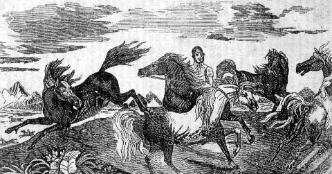 The 1830 editions, published with a Nashville imprint, are characterized by a folksy, if occasionally slightly off-color, humor interspersed with factual, informative material. Typical stories in the 1830s include “Davy Crockett’s Early Days, Severe Courtship and Marriage” (1835) that relates tales of Crockett’s youth and early courtships in an entertaining but fairly straightforward manner. Crockett’s first love was particularly memorable: “For though I have heard people talk about hard loving, yet I reckon no poor devil in this world was cursed with such hard love as mine has always been, when it came on me. I soon found myself head over heels in love with this girl; and I thought that if all the hills about there were pure chink, and all belonged to me, I would give them if I could just talk to her as I wanted to; but I was afraid to begin, for when I would think of saying anything to her, my heart would begin to flutter like a duck in a puddle; and if I tried to outdo it and speak, it would get right smack up in my throat, and choke me like a cold potato.” When Crockett does manage to convey his ardent feelings to the young girl, she confesses she is engaged to another, which sent our hero into a sickness, “it was the worst kind of sickness, - a sickness of the heart and all the tender parts, produced by a disappointed love.” The 1837 edition includes the tales of “Perilous Adventure with a Black Bear” and “Fatal Bear Fight on the Banks of the Arkansaw (sic).” The factual information also continued, as in the astrological charts and the essay “Method of Catching Wild Horses on the Prairies of Texas.”
