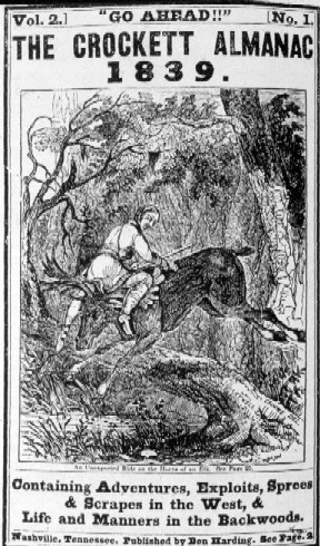 The Roots of American Folklore are frequently traced to the tall tales of the Crockett Almanacks. Although they were not written by the historical figure Davy Crockett, it is clear that he participated in the creation of his own mythical personae and thus in the creation of Western folklore and the myth of the frontier. Crockett’s A Narrative of the Life of David Crockett of the State of Tennessee, published in 1834, is characterized as a “campaign biography” - an historically authentic account of his life embellished with promotional rhetoric and early examples of what becomes the classic humor of the West and Southwest. |