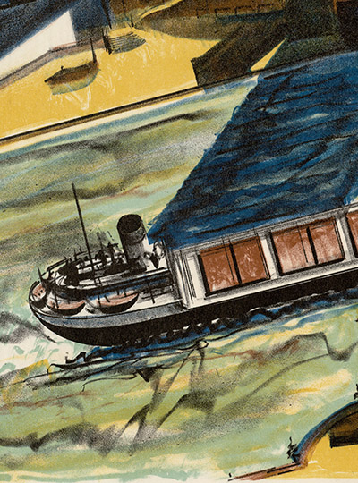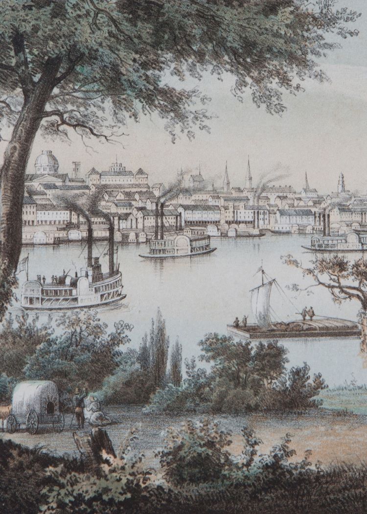 The format of the panorama, the 19th century version of moving pictures unrolled from one giant spool to another across torch-lit stages flanked by curtains, was uniquely suited to river scenes, allowing the verdant green shores and the river towns – whether sleepy or burgeoning – to flow past the viewers as if they were actually traveling the river by boat. The panorama format became popular in all sizes, often as fold-outs in travel books. The selection of river panoramas shown here are rarely ever seen treasures from the Herman T. Pott National Inland Waterways Library collection.