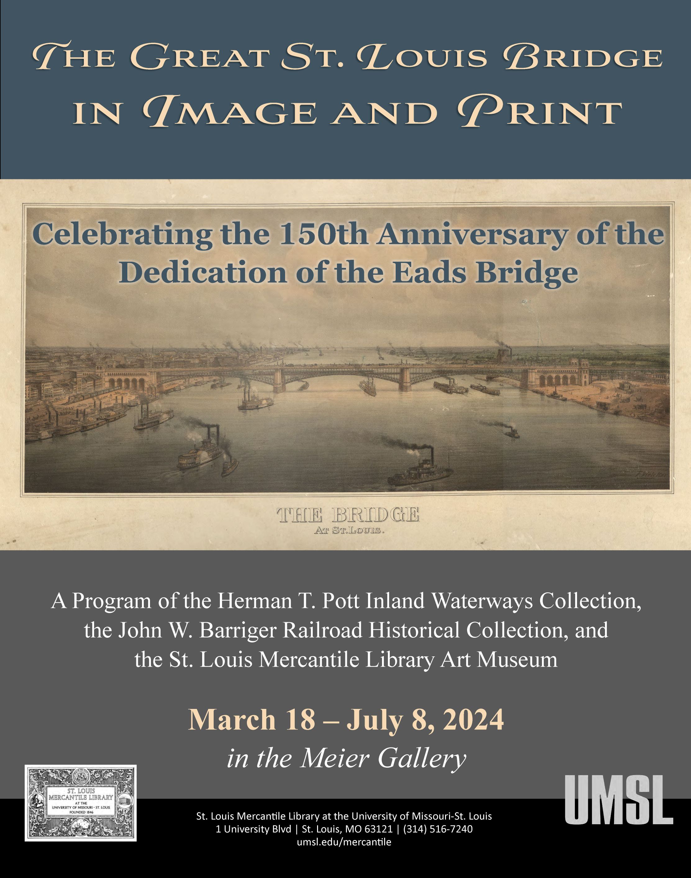 From the time of its completion in 1874, the Eads Bridge became an iconic symbol of the industry, modernity, and energy of the city of St. Louis. The St. Louis Mercantile Library celebrates this anniversary with a focused exhibition of 35 objects highlighting selections from its transportation, archival, and fine art collections that illustrate the bridge’s construction, its history, its use as a symbol, and the ways artists depicted its ground-breaking design.