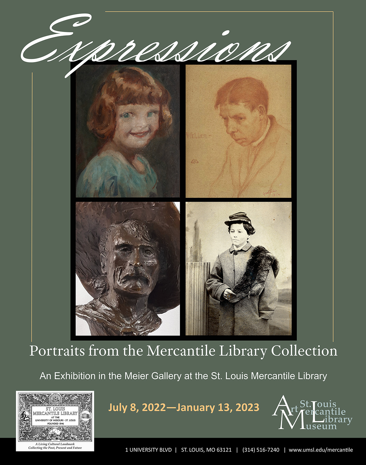 Portraits were the earliest works of art collected by the Mercantile Library, and this genre can now be found across many of our collections. This exhibition examines the concept of the portrait by displaying selections from the fine art, rare book, and political collections that served very different purposes at the time they were created. For example, political campaigns rely heavily on the portrait to identify the candidate and are a persuasive tool to recruit voters. Portraits of known subjects can also be persuasive - especially if the sitter wished to convey a certain image or message in the work - or they may simply be the artist's most readily available subject - a family member. When the sitter is unknown, the portrait may be symbolic or simply an appealing image that caught the artist's eye. Portraits of artists, whether created by themselves or by another artist, provide a unique insight into the lives of artists and the nature of their friendships. This exhibition is just a highlight of the portraits in the Mercantile collection, and you are invited to view additional examples on display on Level 1 and listed on the last page of this brochure.