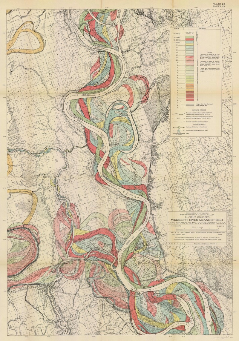 According to Mark Twain, writing in Eruption, “The Mississippi River will always have its own way; no engineering skill can persuade it to do otherwise.” The challenge of the ever-changing river is legend for river boatmen, and the need to accurately map it continues to today. This series of rare, colorful, century-old maps designed by Army Corps of Engineers cartographer Harold Fisk in 1938, document the changing course of the Father of Waters over time, and are a unique printed view of the Mississippi River unlike any other.