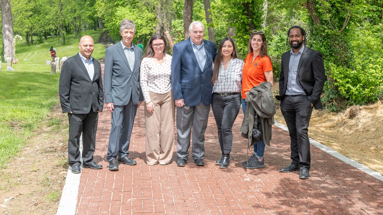 Dwayne Perry wore a big smile as Shelly Morris cut the symbolic burgundy ribbon at Greenwood Cemetery, marking the opening of a state-of-the-art road resulting from two years of hard work by Perry, UMSL engineering students, and several partners. Perry, then a student in the UMSL/Washington University Joint Undergraduate Engineering Program, was part of a volunteer group, [working] to help solve the flooding and erosion issues of the cemetery's back road. More than 100 people attended the ribbon-cutting ceremony, where Perry emphasized the cultural and communal significance of Greenwood Cemetery, founded in 1874 as the first African-American non-sectarian cemetery in St. Louis.
