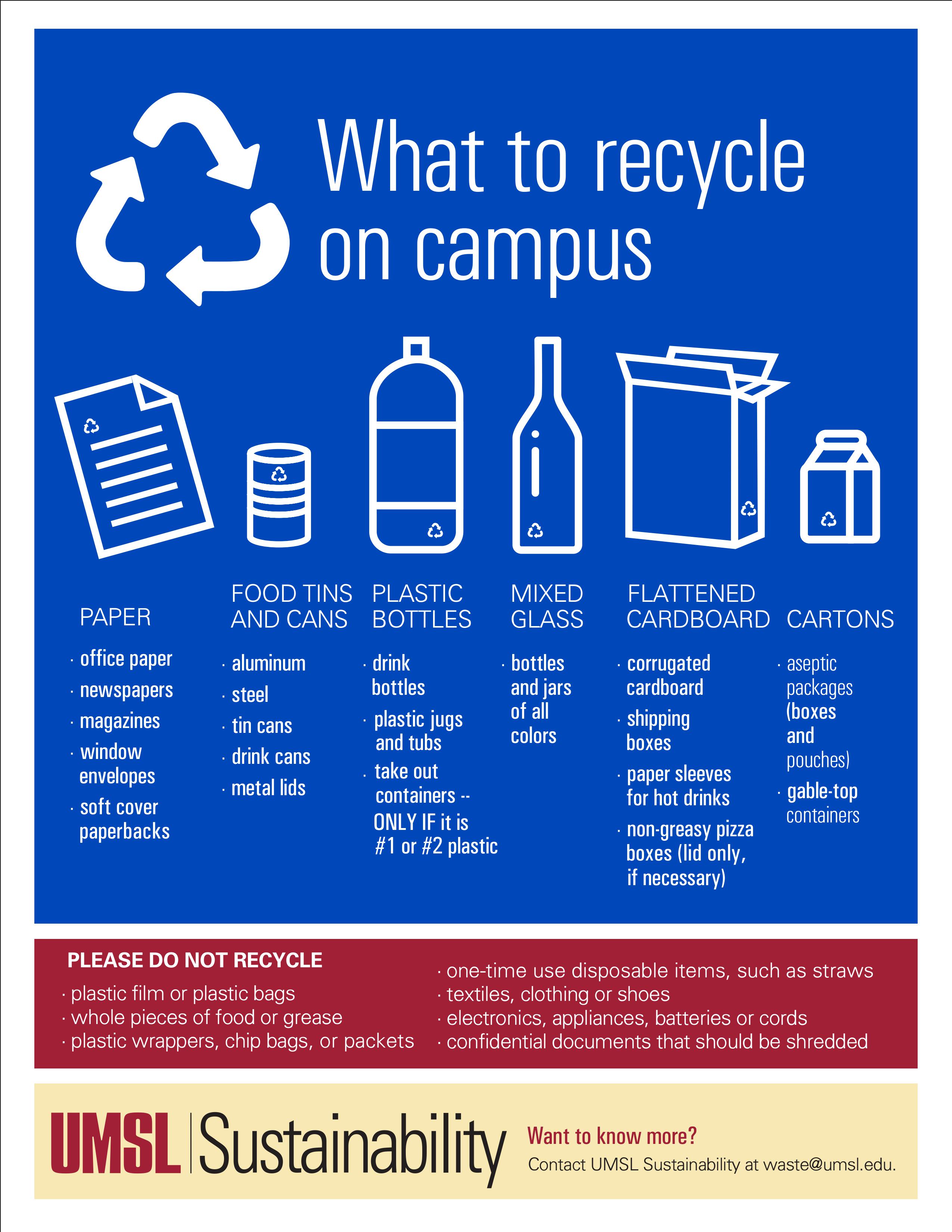 Recycling at UMSL is easy! We have "single stream" recycling on campus. Single-stream (also known as "commingled" or "single-sort") recycling refers to a system in which all paper fibers, plastics, metals, and other containers are mixed together, instead of being sorted into separate commodities and handled separately throughout the collection process.