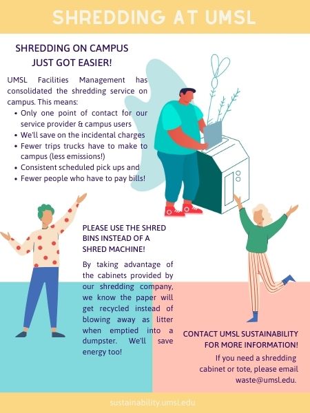 On behalf of UMSL Facilities Management, UMSL Sustainability facilitates the University's paper shredding service. By placing your paper in a shred bin, you are guaranteeing that any information on that paper is safely destroyed as that paper is recycled.