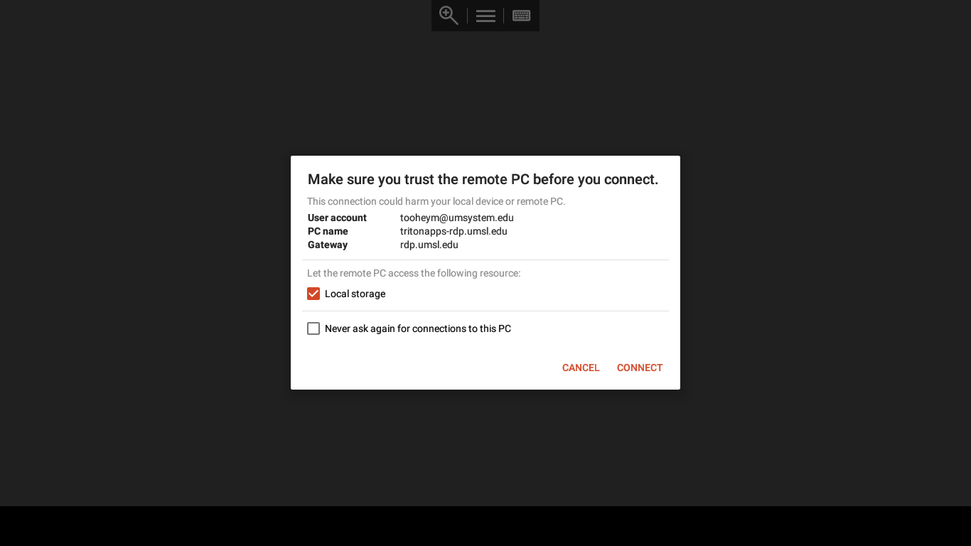 - The first time an application is launched, you may see a warning asking if you trust the remote PC. You may want to select "Never ask again for connections to this PC" before clicking Connect.