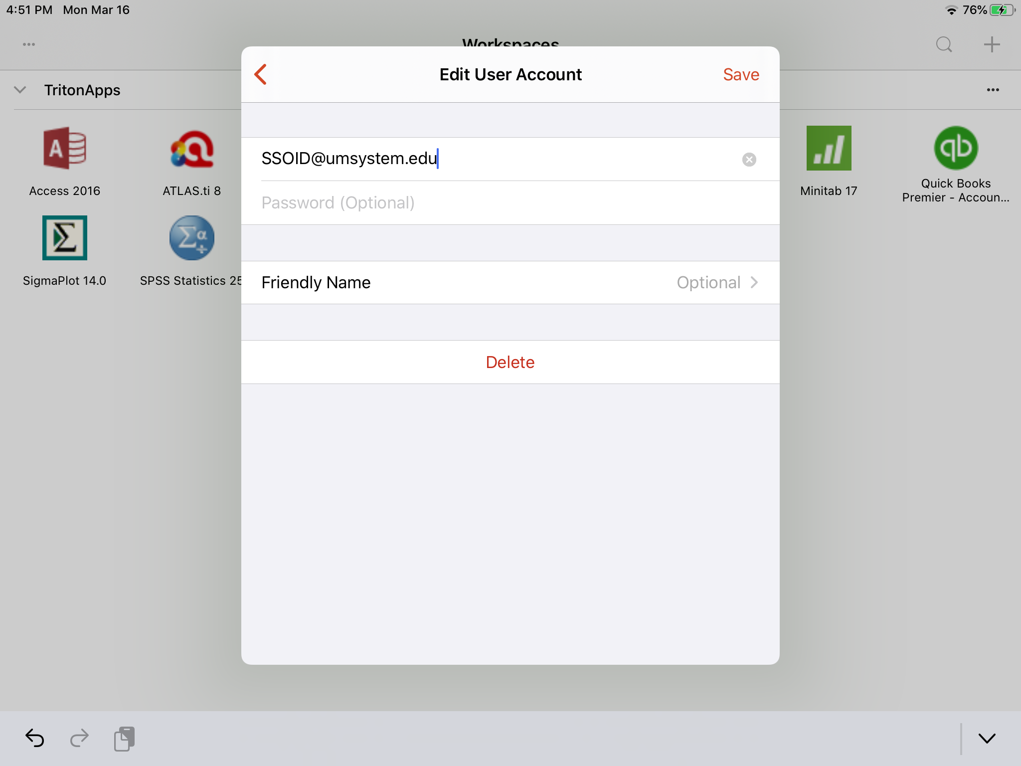 - Enter your username as SSOID@umsystem.edu with your SSO password, and click Save.