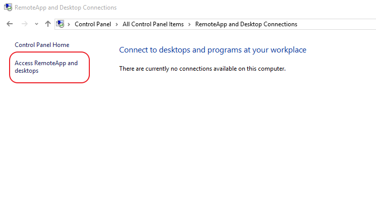 - In RemoteApp and Desktop Connections window, click Access RemoteApp and desktops