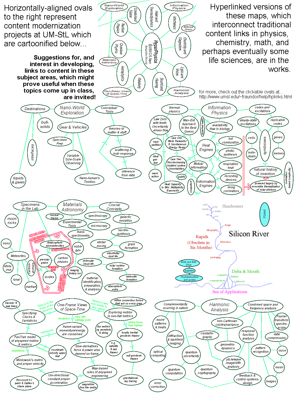 A request for input on links in these six areas, useful when these topics come up in the classroom, may be found here. This page is hosted by the Department of Physics and Astronomy (and Center for Molecular Electronics) at UM-StL. Whole-site page requests est. around 2000/day hence more than 500,000/year. Requests for a "stat-counter linked subset of pages" since 4/7/2005: .
