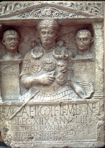| Tombstone of M. Caelius, centurion of LegioXIIX, who died at age 53 (set up as a cenotaph by his brother since his body was not found).