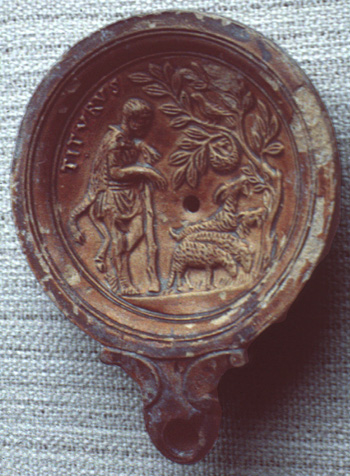| Terra-cotta lamp portraying shepherd with name Tityrus.
