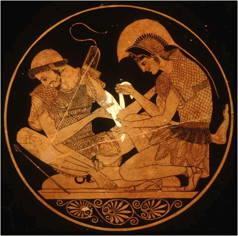 | Achilles binding the wounds of his dearest friend, his beloved Patroclus. Late Archaic/early classical red figure kylix (drinking cup). En.wikipedia.org, Staatliche museum, Berlin