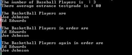 import java.util.ArrayList; import java.util.List; import java.util.stream.Stream; public class Teams { enum Sport {Baseball, Football,Basketball,Hockey} class athlete { public Sport game; public String name; public String year; //Frosh, Soph, Jr, Senior public int testgrade; //entrance exam grade public athlete(Sport s,String n,String y,int t){ game=s; name=n; year=y; testgrade=t; } } public static void main(String args[]) { new Teams(); } public Teams(){ athlete ss = new athlete(Sport.Baseball, "Sam Smith", "Jr", 95); athlete jj = new athlete(Sport.Basketball, "Joe Johnson", "Jr", 90); athlete rb = new athlete(Sport.Baseball,"Robert Brown", "Soph", 80); athlete bj = new athlete(Sport.Hockey, "Bob Jones", "Jr", 85); athlete jr = new athlete(Sport.Baseball, "Joe Roberts", "Senior", 65); athlete le = new athlete(Sport.Basketball,"Ed Edwards", "Soph", 70); List<athlete> allplayers = new ArrayList<>(); allplayers.add(ss);allplayers.add(jj);allplayers.add(rb); allplayers.add(bj);allplayers.add(jr);allplayers.add(le); Stream<athlete> playerstream = allplayers.stream(); Stream<athlete> baseballers = playerstream.filter((a) -> a.game==Sport.Baseball); long thecount=baseballers.count(); // int value= baseballers.mapToInt((a)-> a.testgrade).sum(); error: stream acted on or closed. /////////////////////////////////////////////////////////////////////////// int value=allplayers.stream() //A stream of athletes. .filter((a) -> a.game==Sport.Baseball) //into A stream of Baseball Players. .mapToInt((a)-> a.testgrade) // into A stream of integers. .sum(); // into the sum of the stream of integers System.out.println("The number of Baseball Players is : " +thecount+ "\nThere average entrance testgrade is : "+ (value/thecount )); ///////////////////////////////////// System.out.println("\nThe BasketBall Players are"); allplayers.stream() .filter((a) -> a.game==Sport.Basketball) .forEach((a)->System.out.println(a.name)); ///////////////////////////////////// System.out.println("\nThe BasketBall Players in order are"); allplayers.stream() .filter((a) -> a.game==Sport.Basketball) .sorted((a, b) -> a.name.compareTo(b.name)) .forEach((a)->System.out.println(a.name)); ///////////////////////////////////// System.out.println("\nThe Basketball Players again in order are"); allplayers.stream() .filter((a) -> a.game==Sport.Basketball) .sorted((a, b) -> a.name.compareTo(b.name)) .map((a)->a.name) .forEach(System.out::println); } }