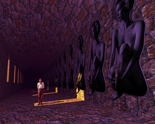 The entire picture was made in Ray Dream Designer, with the exception of placing me in the picture, which I did in Photoshop. The hall was made of a "u" shaped roof extruded back for some distance. The walls were made up of repeated "slabs" containing windows on the left side and the placed image of the woman on the right side. The floor was another flat form extended to the same distance as the walls and roof. A light source was placed outside to create the cast patterns on the floor and walls. The light was arranged to match the direction of the light in the existing slide of me that I planned to place in the image.